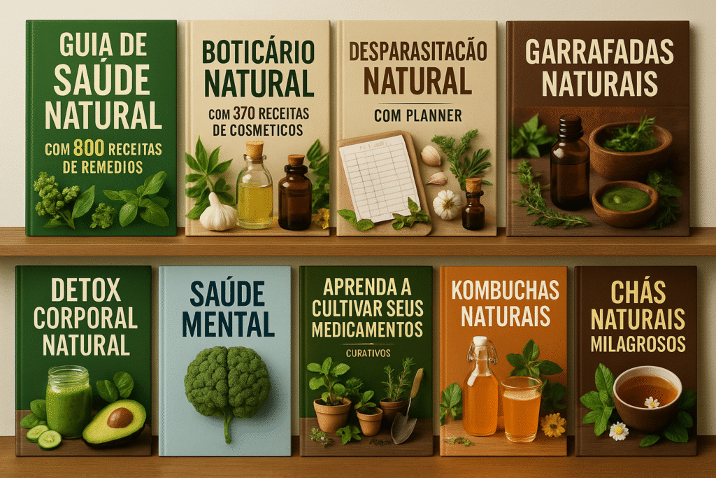 Você receberá 10 eBooks completos com receitas, protocolos e guias práticos — incluindo saúde natural, cosméticos, desparasitação, kombuchas, garrafadas e mais.
